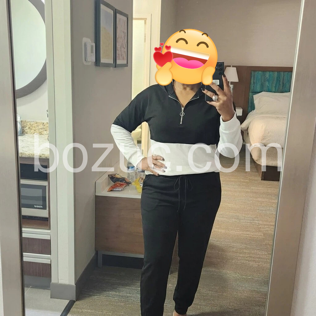 This black and white half-zip loungewear set is so stylish and cozy! The color block design looks way more put-together than basic sweat sets, and the ring pull zipper is such a cute detail. The fabric is soft and stretchy, the sweatshirt fits perfectly, and the joggers have a nice high waist that’s comfortable all day. I wear it for work from home and quick errands.