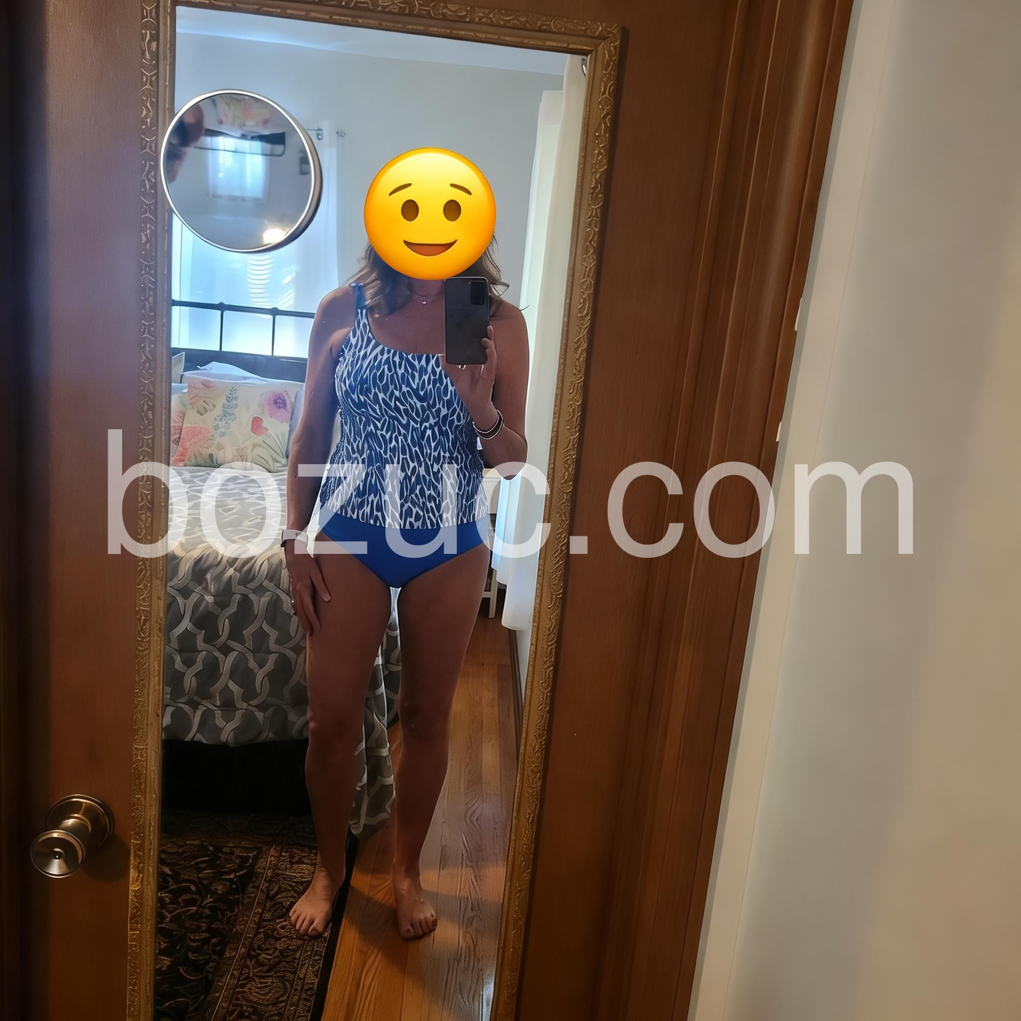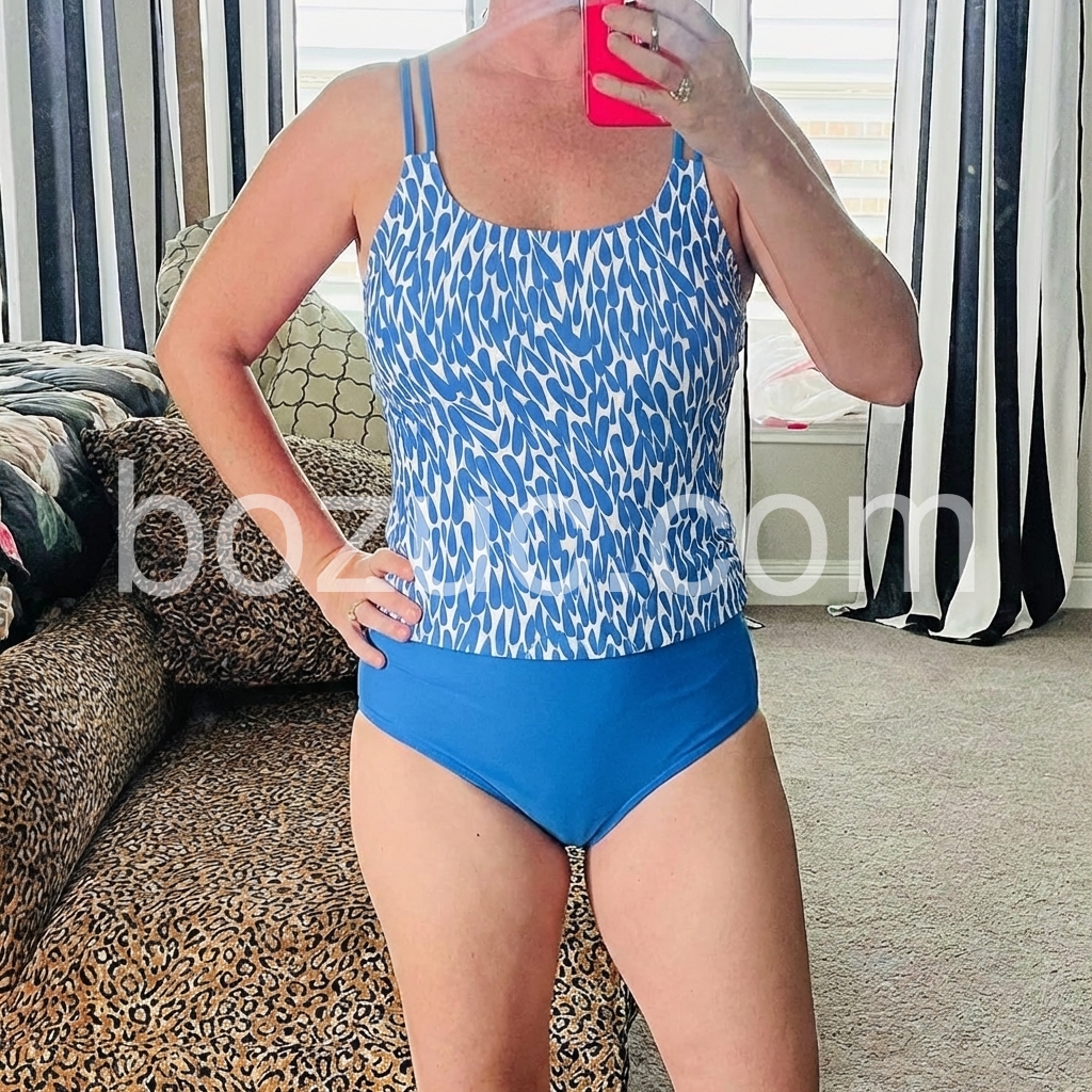 I am very happy with the fit of this two piece suit. The material is durable. Functions well in the water. No worries about the top flipping up. Light weight with comfortable stretchiness. I’ve had compliments.