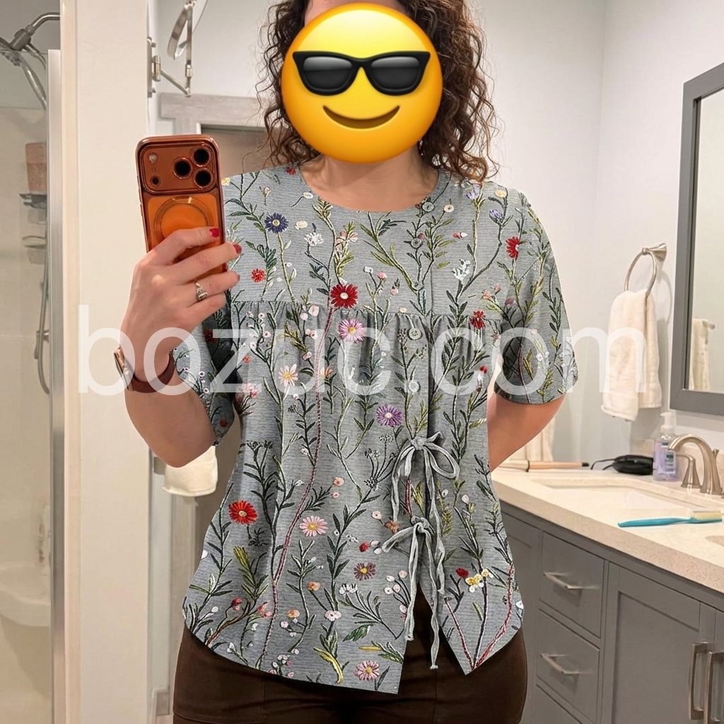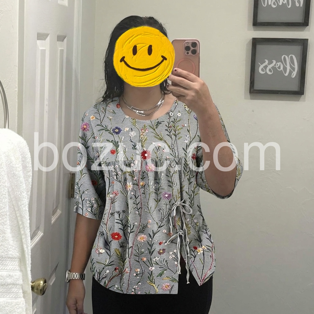This blouse celebrates the beauty of nature with a vibrant, hand-drawn floral print. The soft gray base, accented with multicolored botanicals, feels fresh and lively.