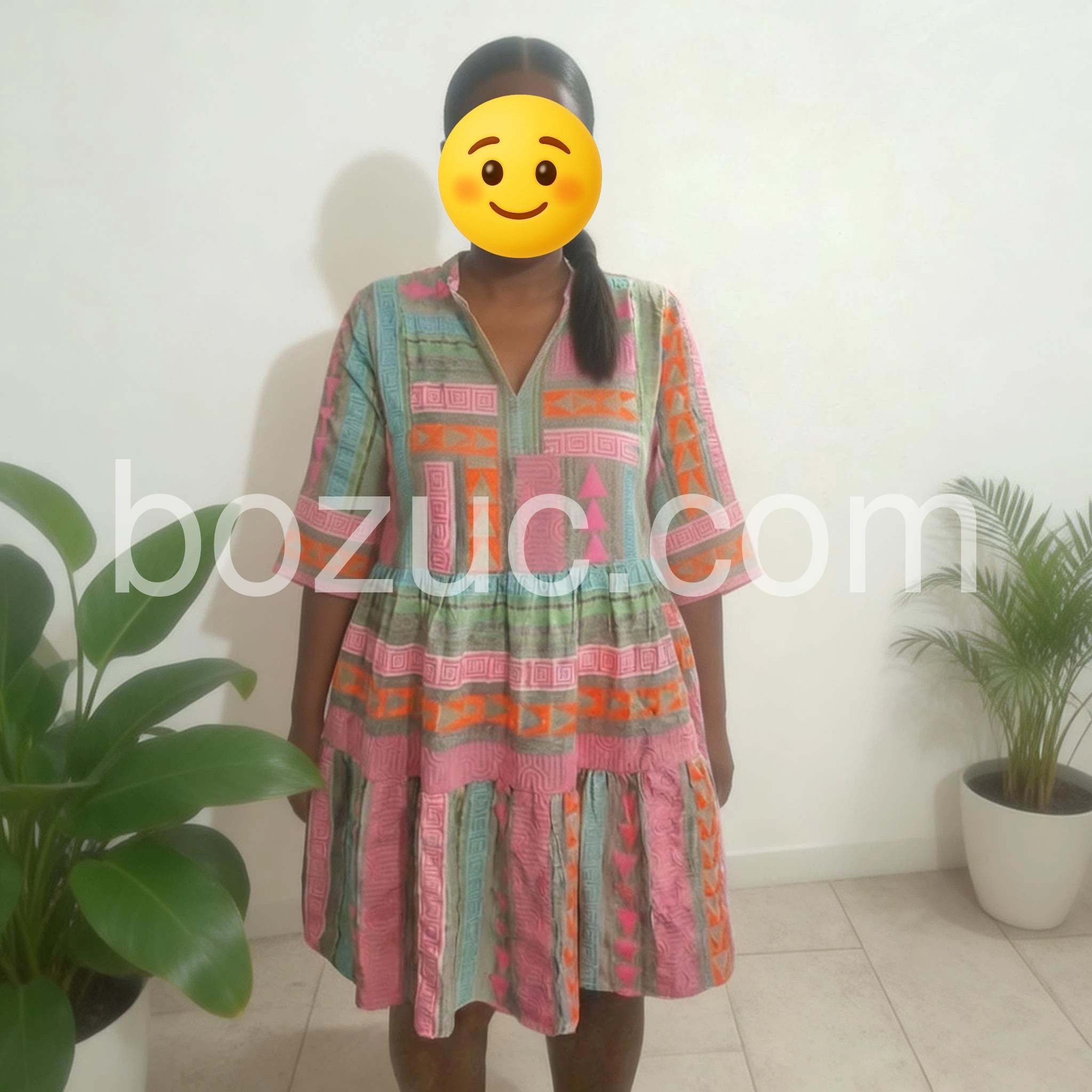I absolutely love the vibrant colors and geometric patterns on this dress! It is super lightweight and perfect for summer. The fit is loose and flowy, which makes it incredibly comfortable for hot days.