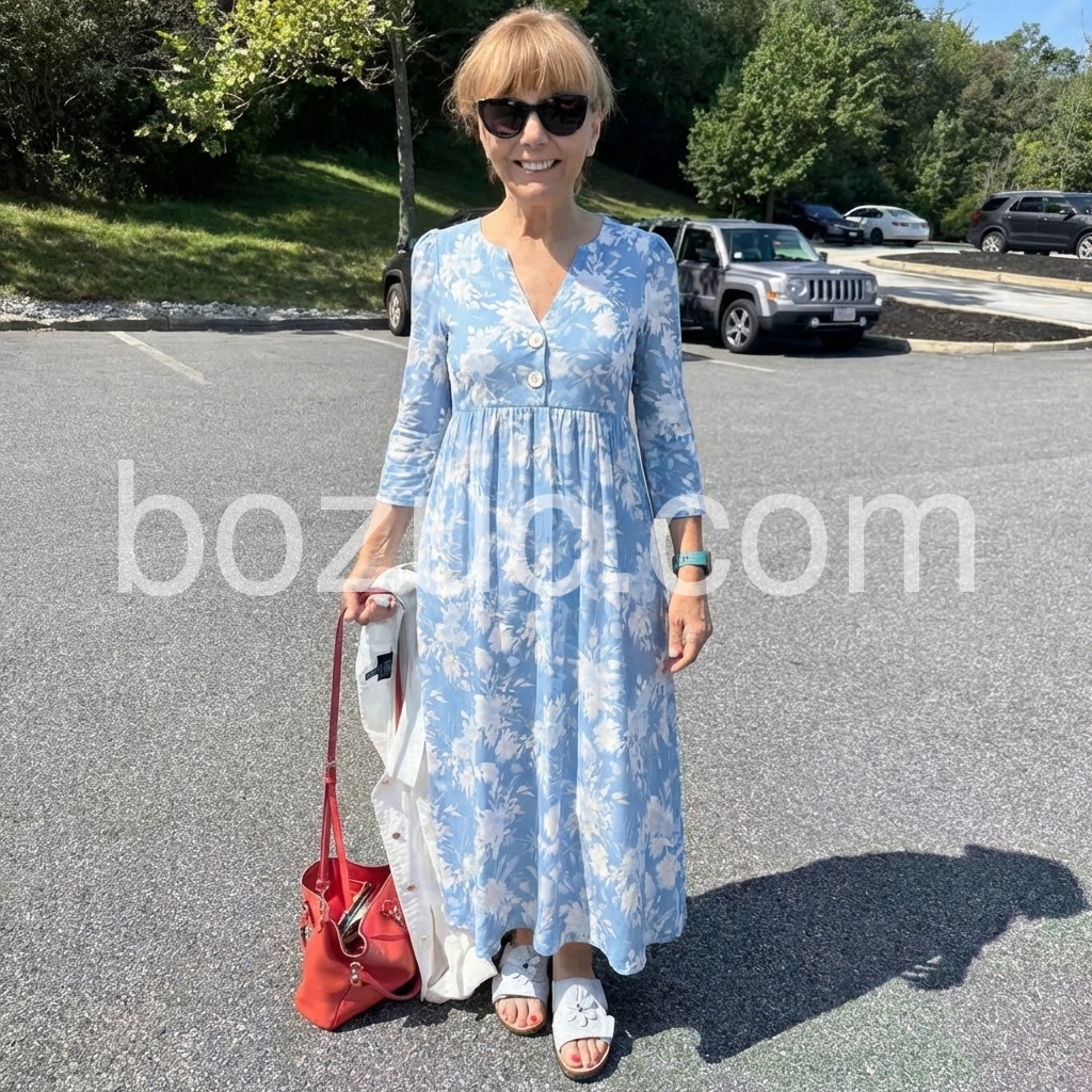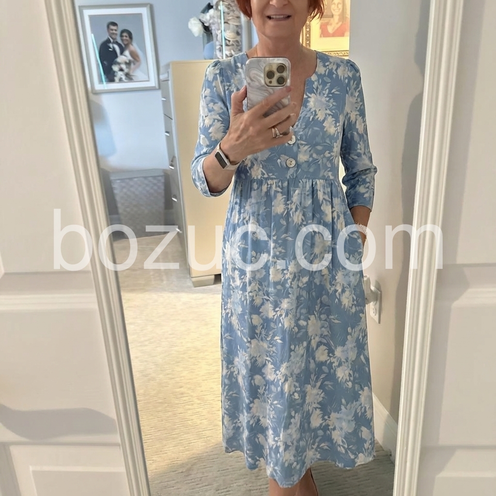 This dress is a study in soft, timeless femininity. The muted blue base, printed with delicate watercolor-style white florals, evokes a gentle, romantic sensibility.