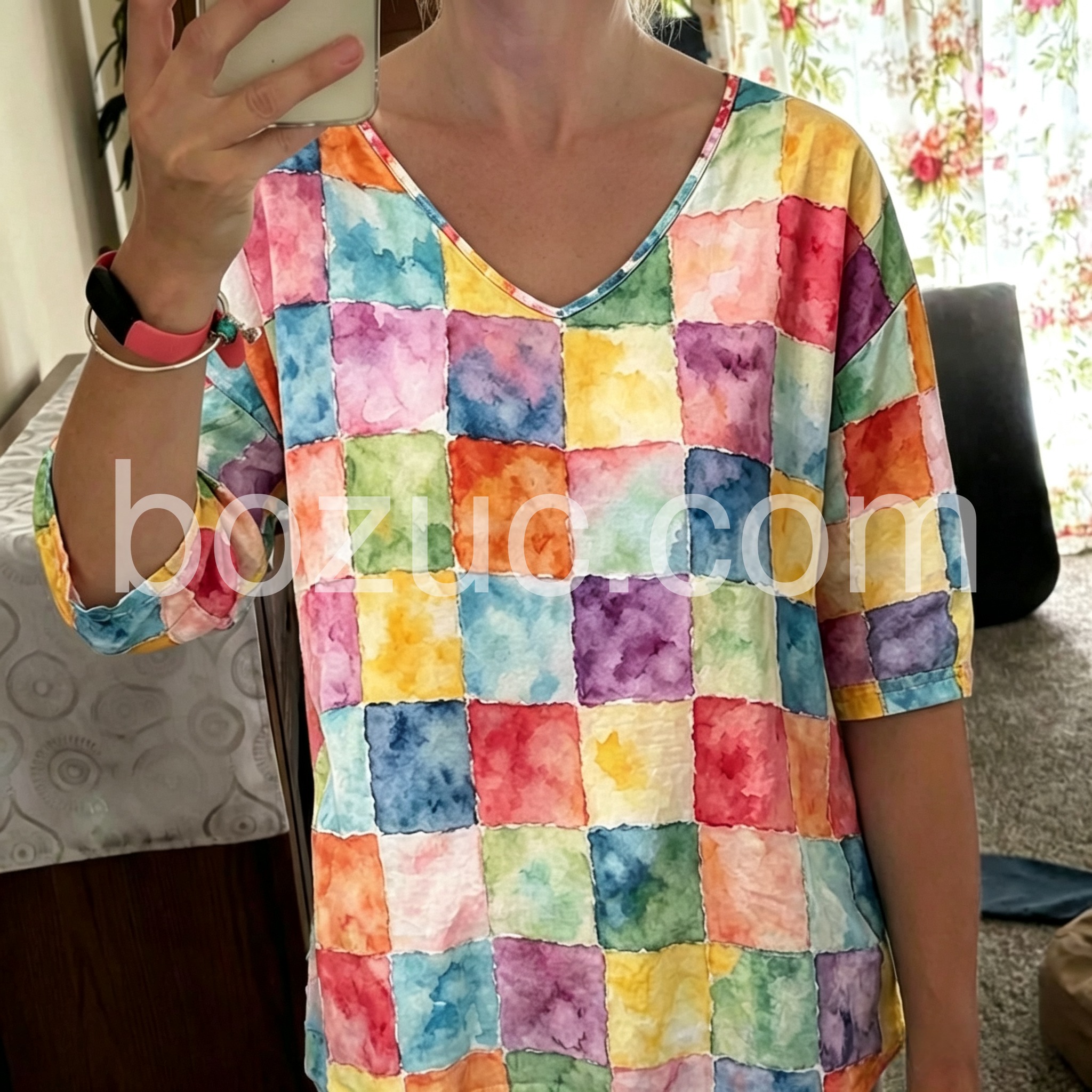 I am totally obsessed with the watercolor squares on this tunic. It gives off a very relaxed, artsy vibe. The sizing guide was accurate, and it arrived quickly.