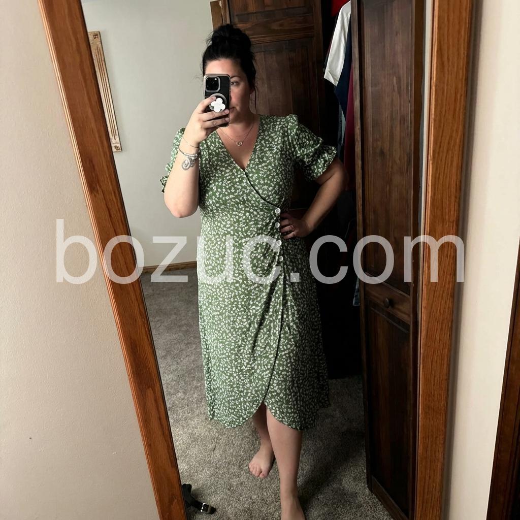 I absolutely love this dress! The green color is so vibrant and the floral print is perfect for spring. The faux wrap style is super flattering on my figure, hiding my tummy area perfectly. Highly recommend!
