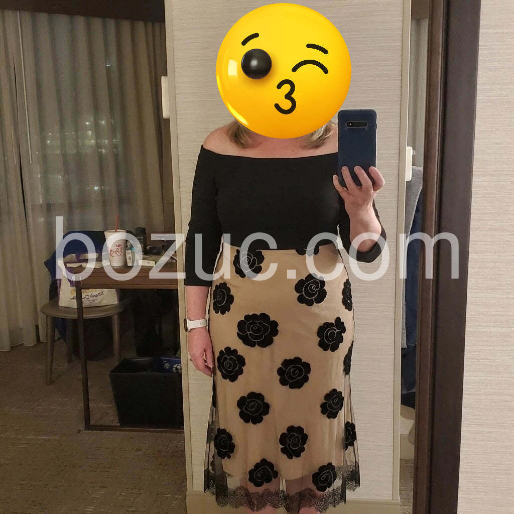 Looks way more expensive than it is! The fabric quality is fantastic. The black flowers on the beige background really pop. It perfectly hugs my curves without being too tight.