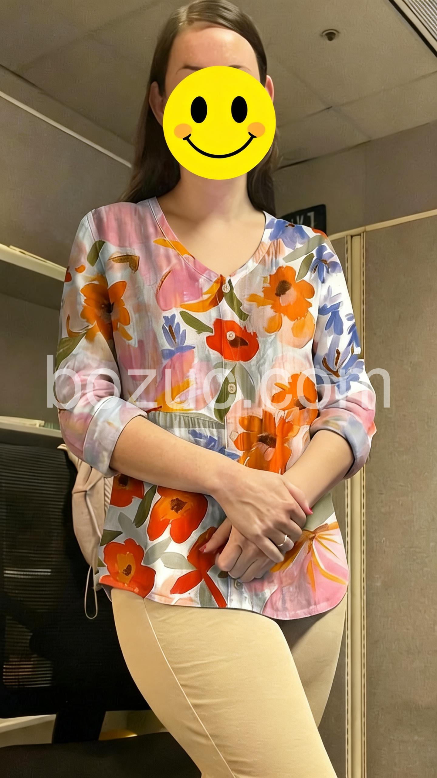 This blouse is so flattering. It has a slight flowy cut that hides my midsection without looking bulky. The colors are beautiful oranges, pinks, and blues.