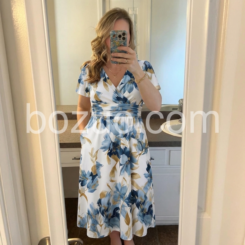 true to size (medium for me- 5’4” 150lbs) and comfortable. I am very pleased with this A line pleated flare dress. The cut is flattering and the overall construction feels well done. I ordered a size medium as I am normally an 8/10 and the medium worked well. One thing I especially appreciate is that it is modest while still looking polished. It feels like a complete outfit all on its own, which makes getting dressed simple. I am very happy with it and would recommend it.