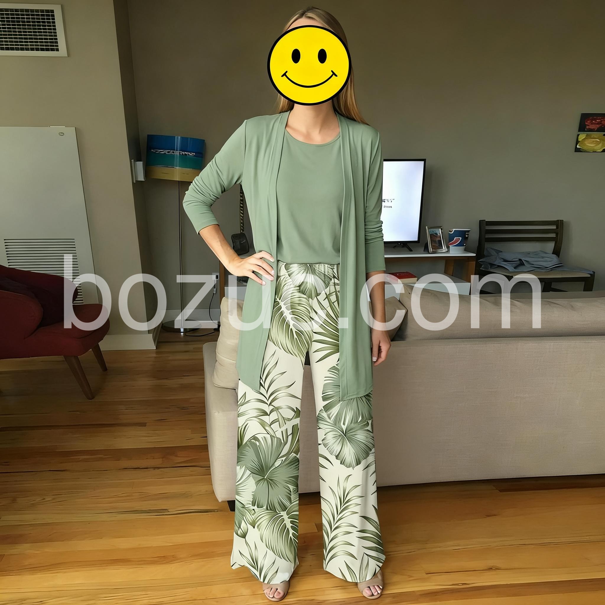 This three-piece set features a soft sage green drape cardigan with a relaxed fit. Paired with wide-leg pants in a leafy tropical print for a fresh, nature-inspired look. Lightweight fabric ensures comfort and breathability. Ideal for casual outings or warm-weather days. Effortlessly chic with a touch of boho elegance.