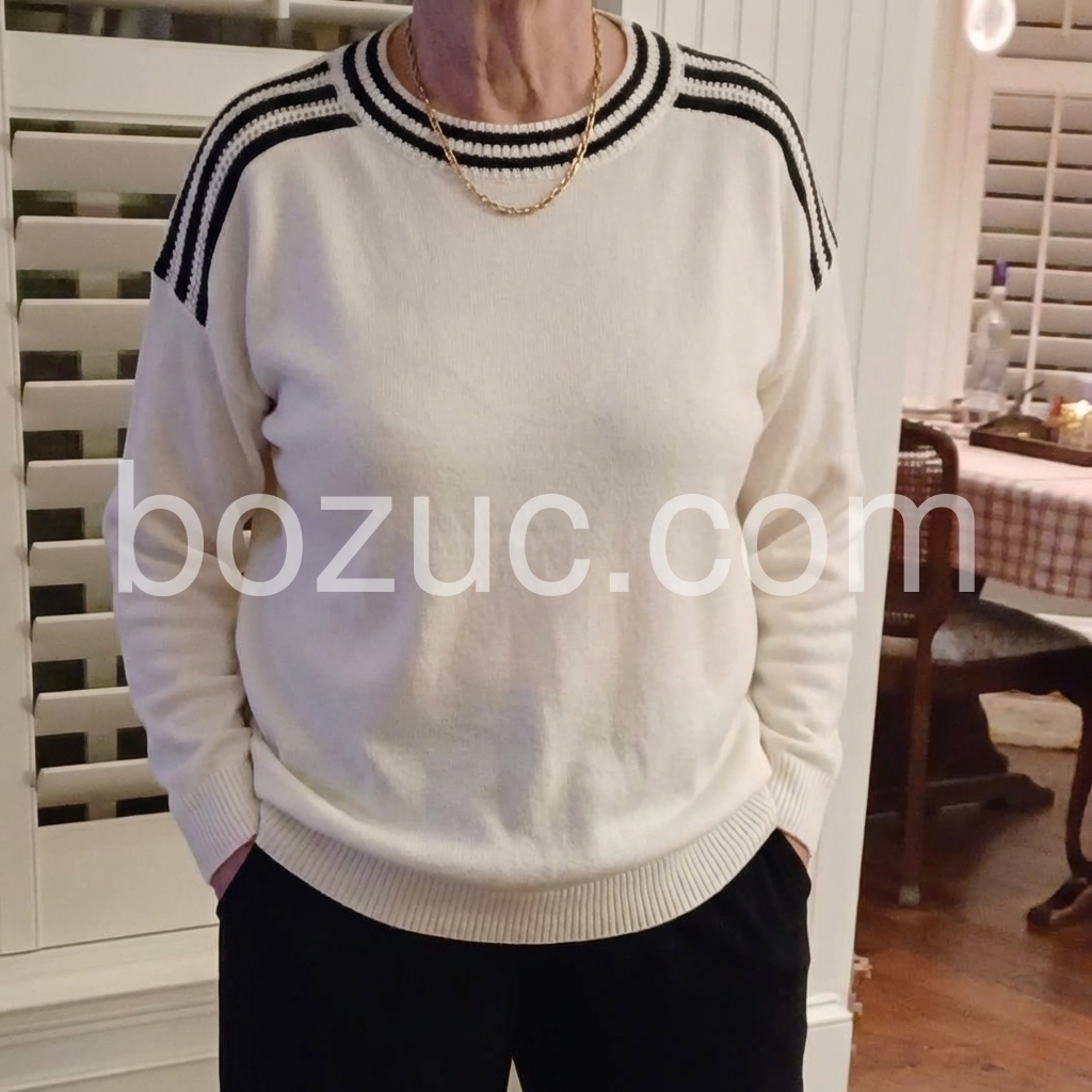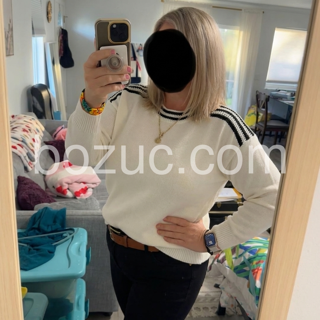 This sweater is a perfect blend of comfort and style. The black-and-white striped neckline gives it a distinctive, classic look, and the plain white body makes it easy to pair with almost anything. The knit fabric feels smooth and cozy, and the fit looks really nice on. I’ve already recommended it to a friend!