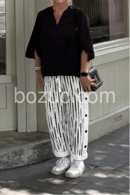 These pants are absolutely amazing! The black and white brushstroke pattern is so chic, and the elastic waist makes them incredibly comfortable for all-day wear. I love the side button details, it adds such a unique touch. Highly recommend for a stylish summer outfit!
