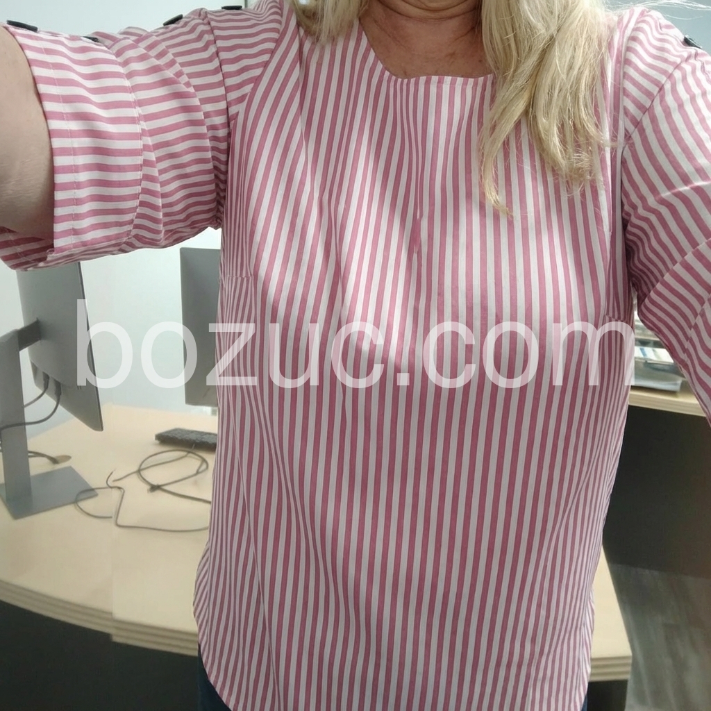 his loose-fit top features vertical pink and white stripes with stylish button details on the sleeves. Three-quarter sleeves with rolled cuffs offer a relaxed look. Round neckline for a clean, comfortable fit. Perfect for casual wear or smart-casual outfits. Bright and cheerful with a touch of elegance.