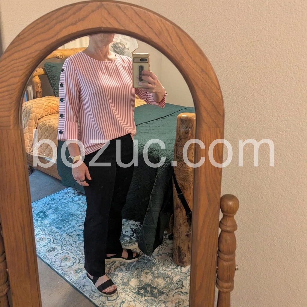 This is my new favorite shirt! It is stylish, comfortable, and the button accents make it stand out. Washes nicely without shrinking.