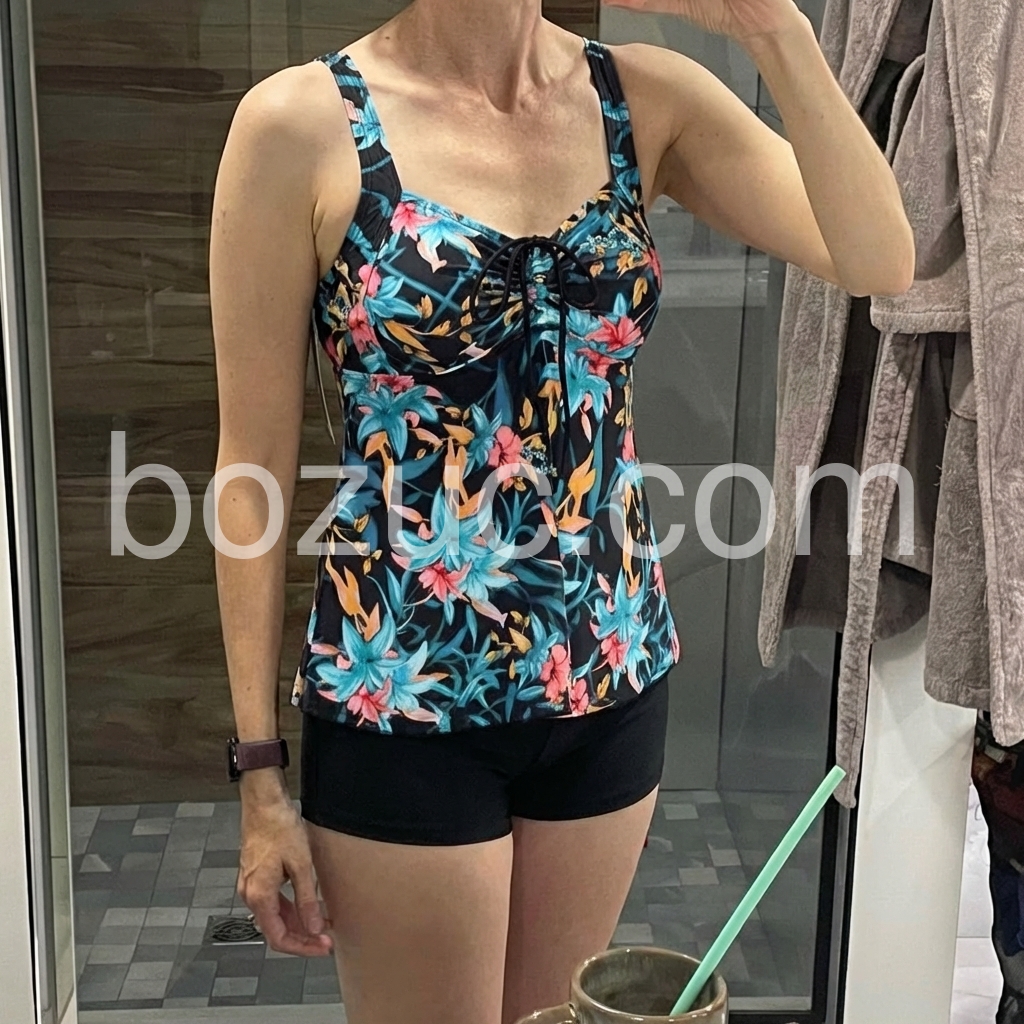 I’m in love with this floral tankini! The dark base with bright blue and pink flowers is so chic, and the tankini top hides my midsection perfectly. The straps are adjustable for a secure fit, and the high-waisted shorts offer modest coverage. It’s lightweight and breathable, great for hot summer days. I’ve received so many compliments—definitely my new favorite swimwear!
