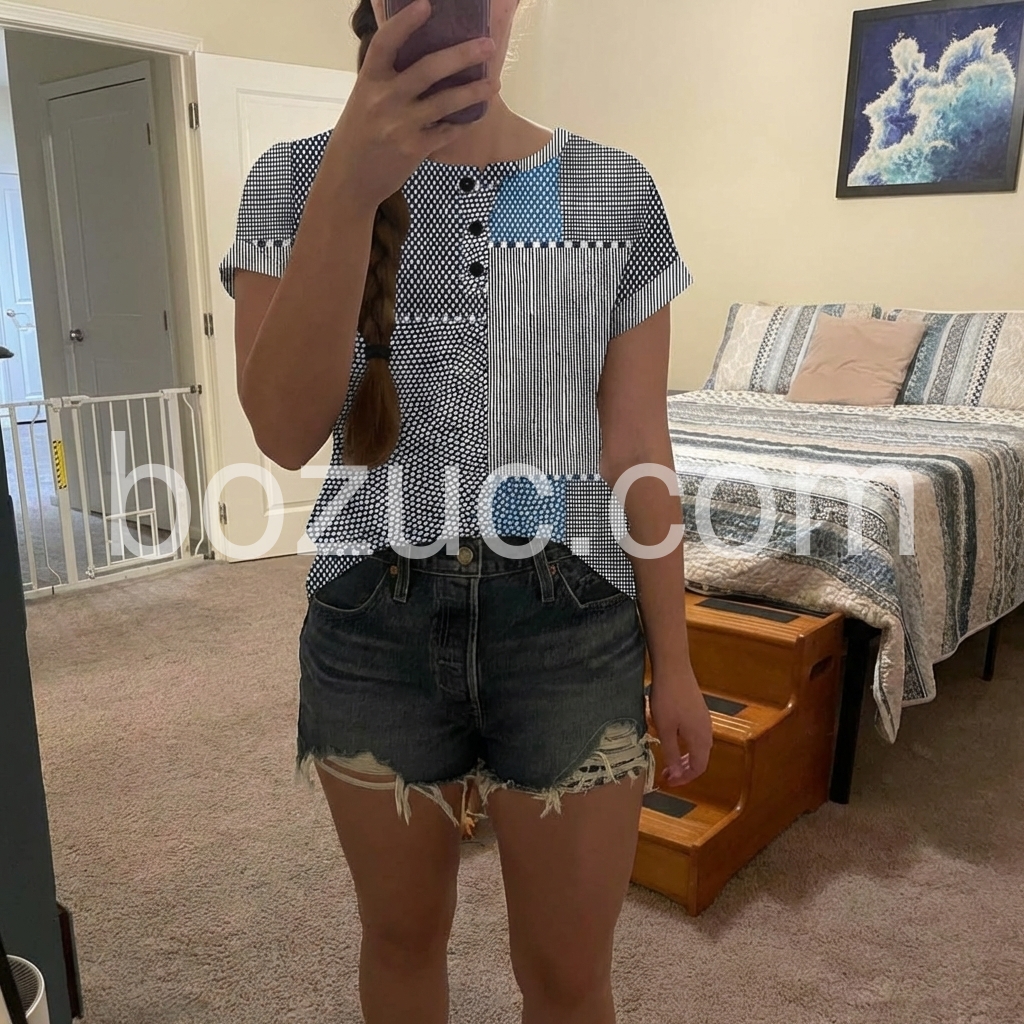 I absolutely love the patchwork design on this top! It is so unique with the mix of stripes and polka dots. The fit is true to size and very flattering. Perfect for casual Fridays at work or a weekend outing.