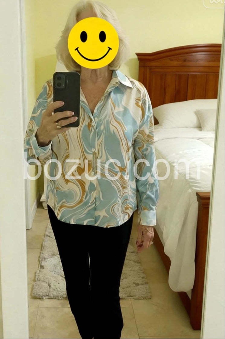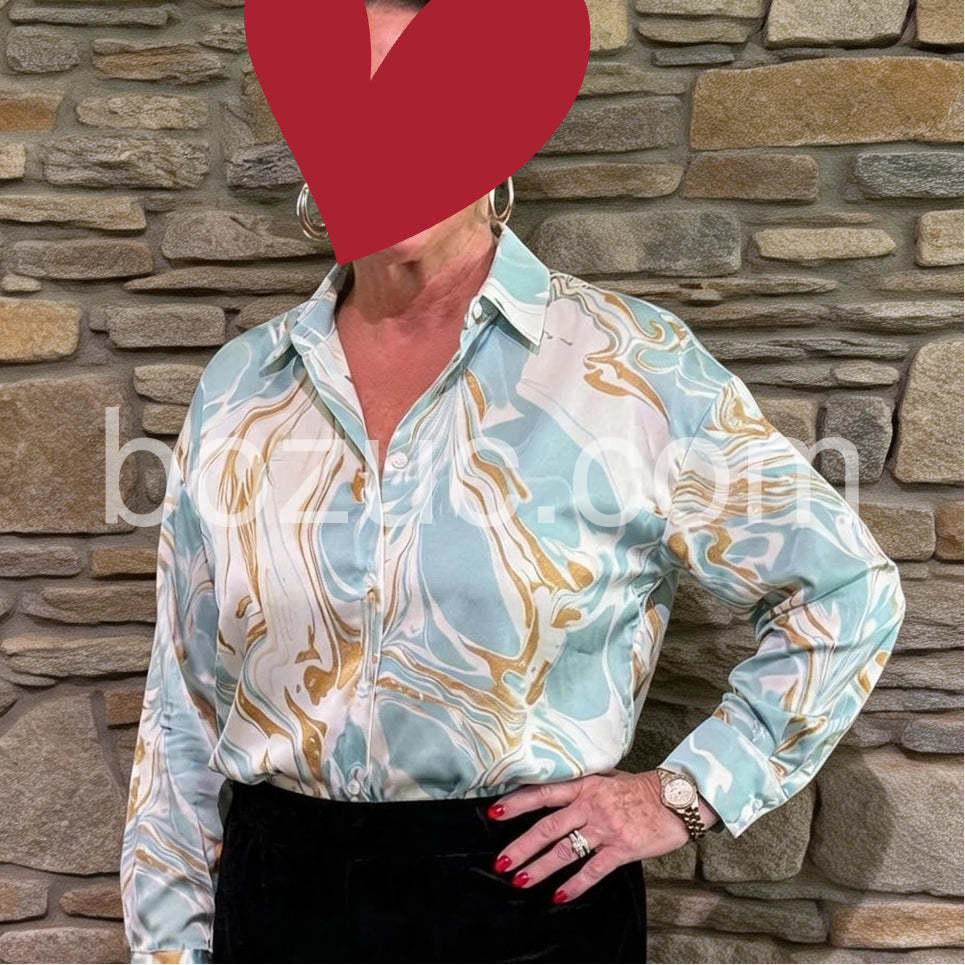 Absolutely love this blouse! The marble pattern is so unique with the light blue and gold tones. It feels like silk against the skin and looks incredibly expensive. I wore it to the office and received so many compliments. Fits true to size.