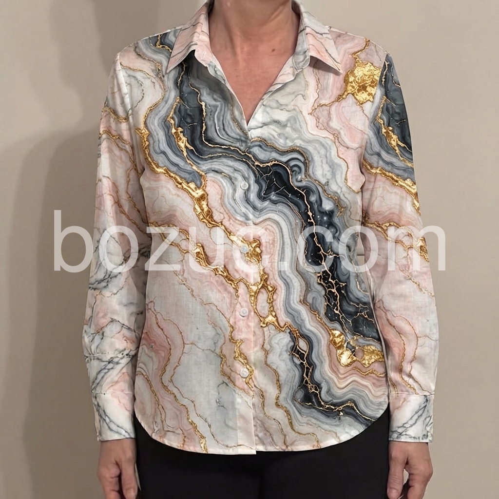 Pink Gold Marble Print Collared Long Sleeve Shirt