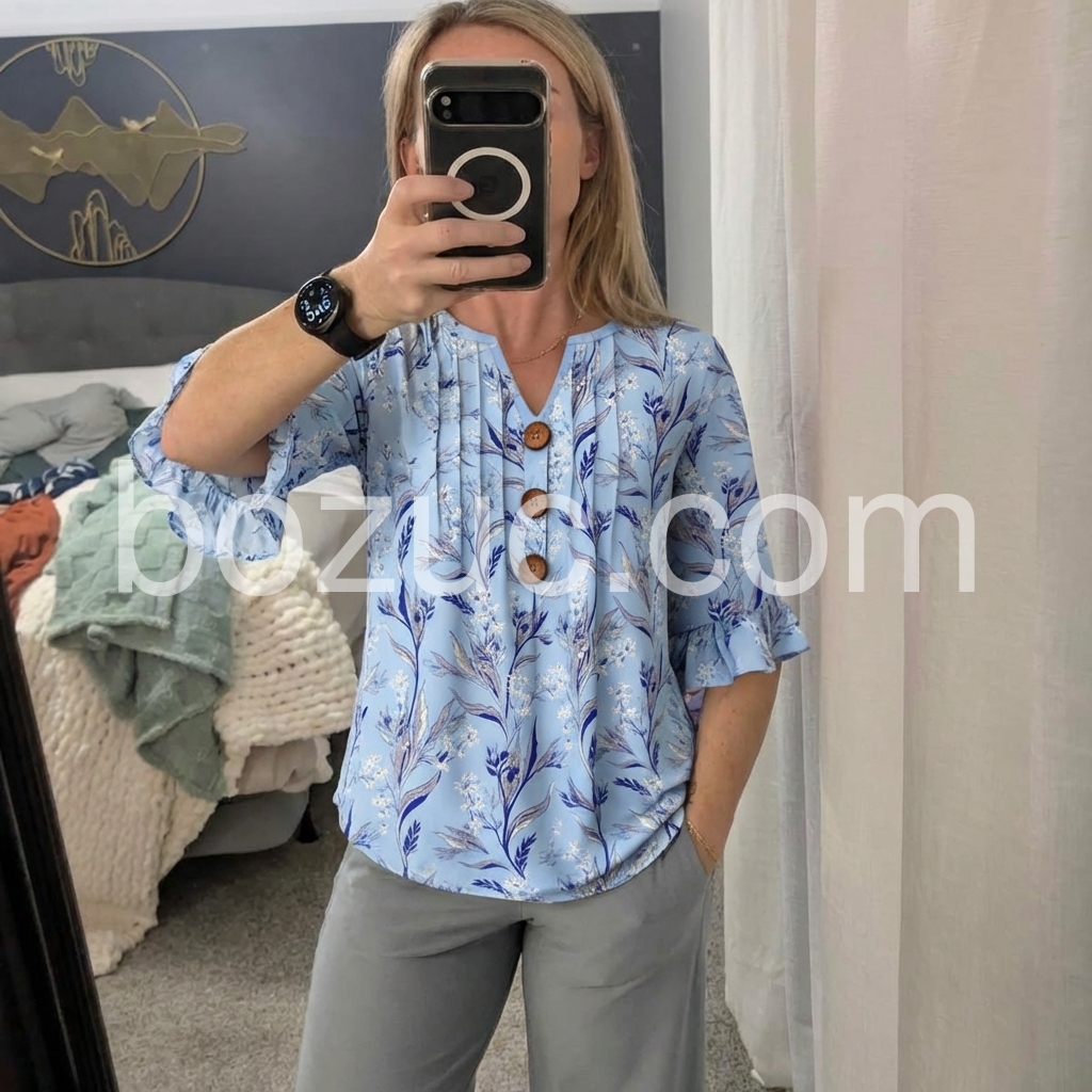 This blouse embodies effortless, feminine elegance. The soft sky-blue base, printed with delicate blue florals and foliage, feels endlessly romantic.