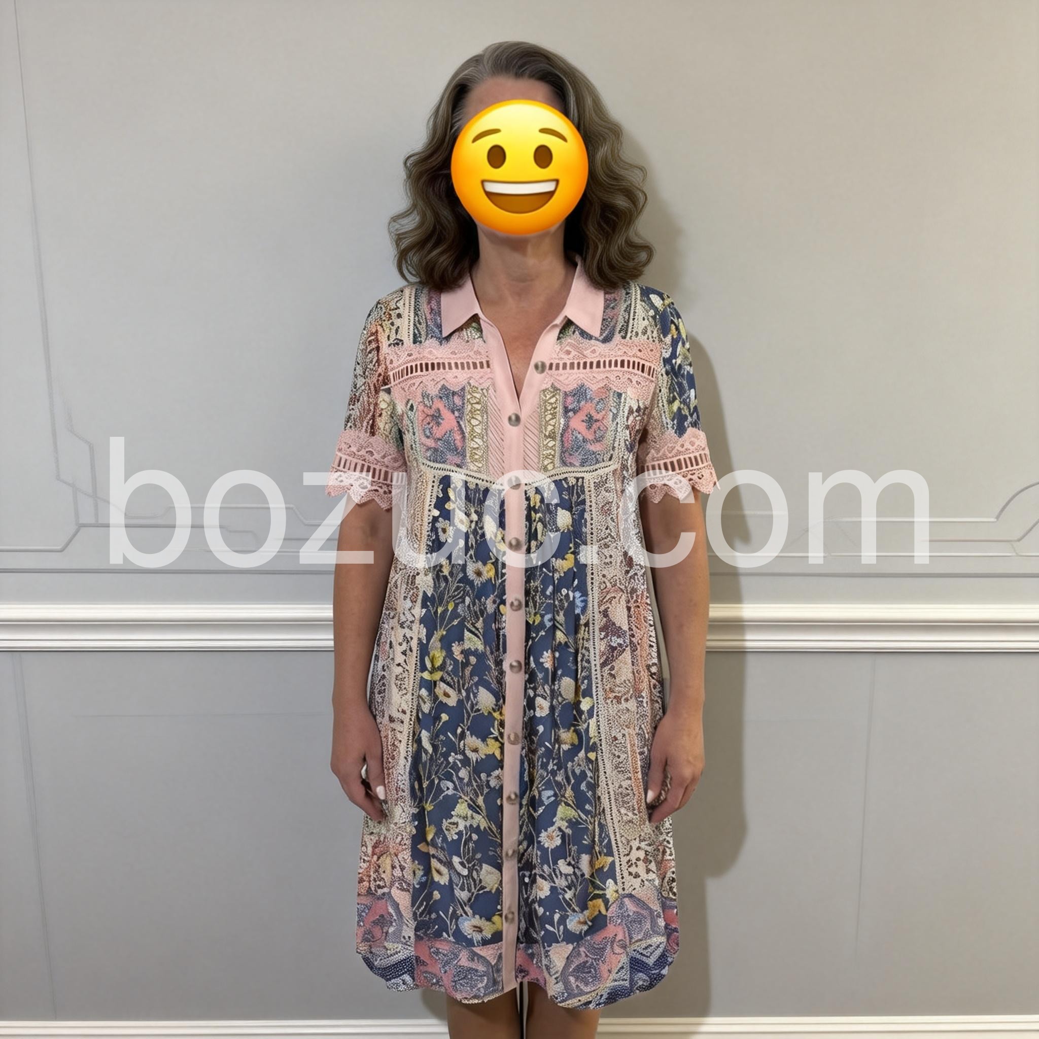 Love the functional buttons down the front. Makes it super easy to put on and take off. The pink collar is a cute contrast to the blue floral skirt part. Runs exactly as the sizing chart says.