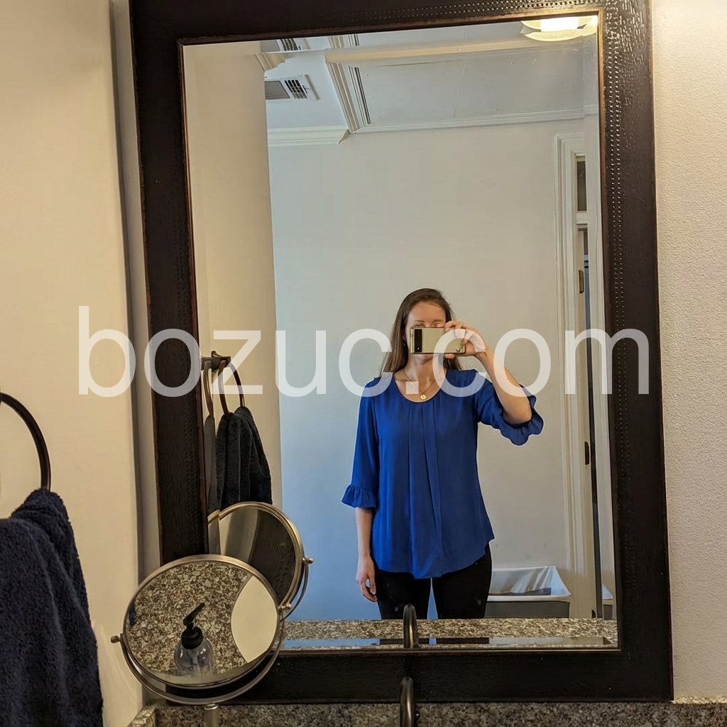 The pleated detail down the middle elevates this from just a basic blouse. The neckline is modest but very cute. Great purchase.