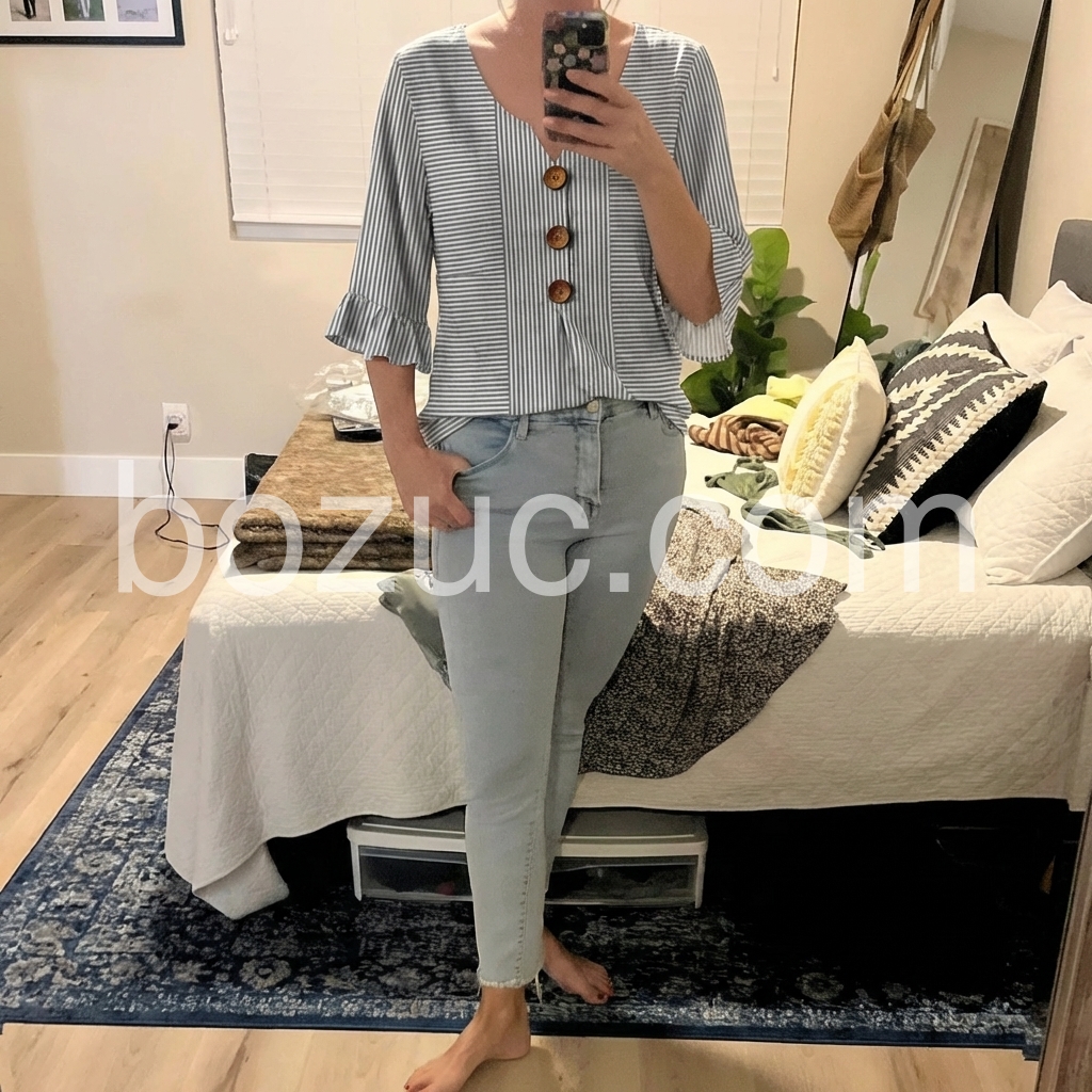 This blouse was created to solve the “boring striped top” problem. The classic grey stripes are updated with a notched V-neck and ruffled three-quarter sleeves, adding feminine charm without being overly frilly.
