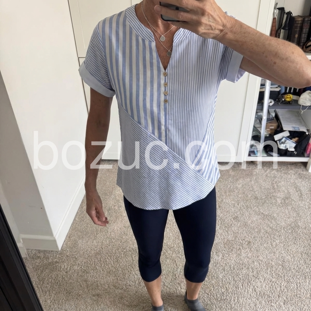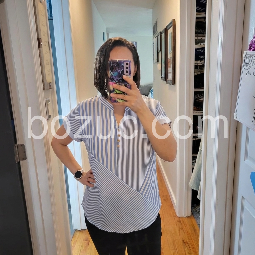 I absolutely love the mixed stripe pattern on this top! It adds such a unique touch to a classic blue and white shirt. Fits perfectly and looks great with my denim shorts.