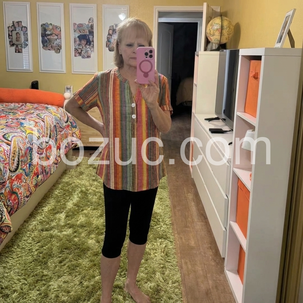 I absolutely love the colors on this top! The vertical stripes are very flattering and give it a fun, retro vibe. It fits true to size and is incredibly comfortable for everyday wear. Highly recommend!