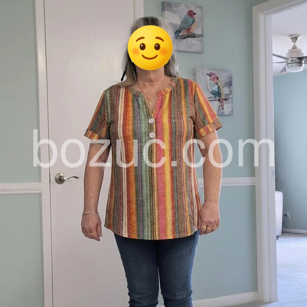 This short-sleeve top features bold vertical stripes in warm tones of orange, red, green, and yellow. V-neckline with button detail for a relaxed look. Lightweight linen blend perfect for summer. Effortlessly stylish and easy to pair. Ideal for casual outings or vacation wear.