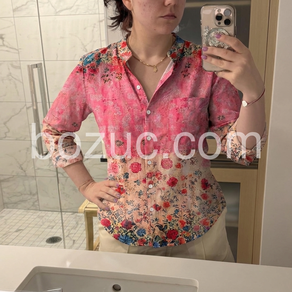 This floral blouse features a beautiful ombre effect, transitioning from bold pink to soft peach with vibrant floral prints. The classic button-down design includes a chest pocket and long sleeves with rolled cuffs. Made from lightweight, breathable fabric for comfort. Perfect for casual days or spring outings. Pair with jeans or trousers for a chic look.