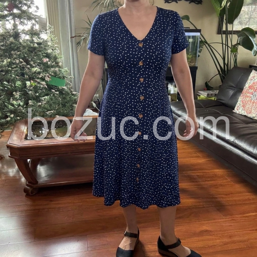 Absolutely love this dress! The navy blue color with tiny white dots is so classic. The material is lightweight and perfect for summer. I love that the buttons go all the way down, giving it a cute vintage vibe. Fits true to size!