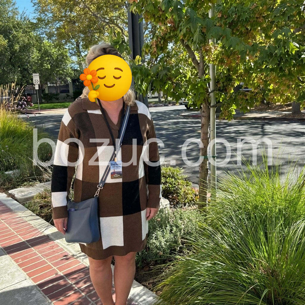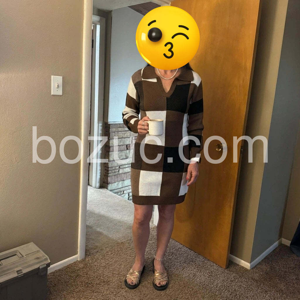 Chic checkered knit dress -- cozy yet polished. The color block pattern is stylish and versatile for everyday wear. Paired with pearl necklace and gold sandals, it looks effortlessly elegant. Comfortable fit and great quality for the price. Smooth online order, fast shipping, and responsive customer support. Highly recommended.