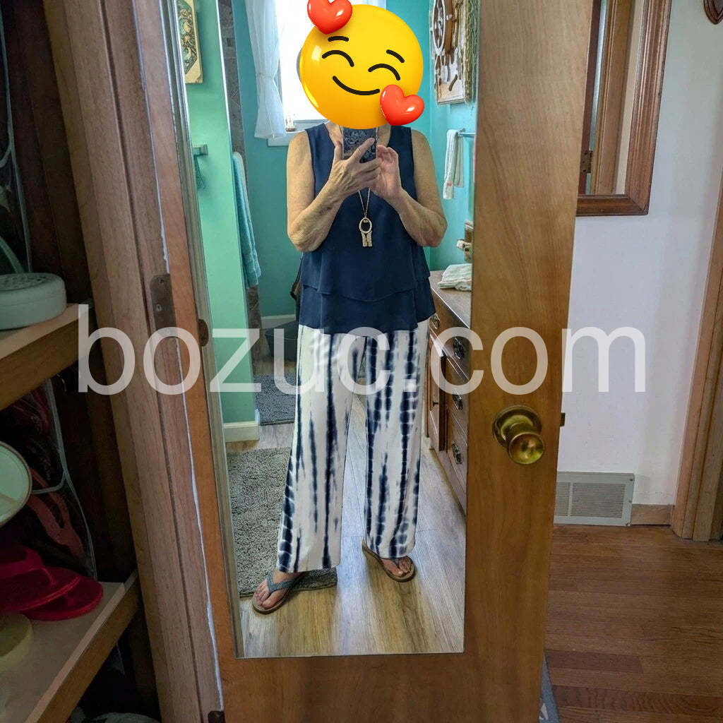 This outfit is casual-chic and comfortable. The navy sleeveless top pairs nicely with the blue-tie-dye wide-leg pants for an easy, summery look. Sandals and a simple necklace finish it off. Great for everyday wear, and the fit feels relaxed yet flattering. Quick, friendly service and fast shipping add to a smooth shopping experience.