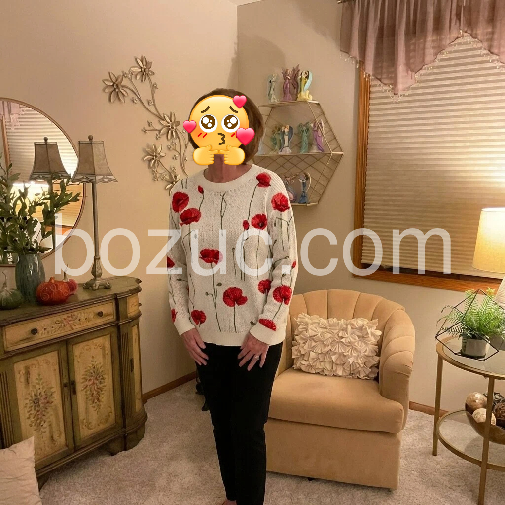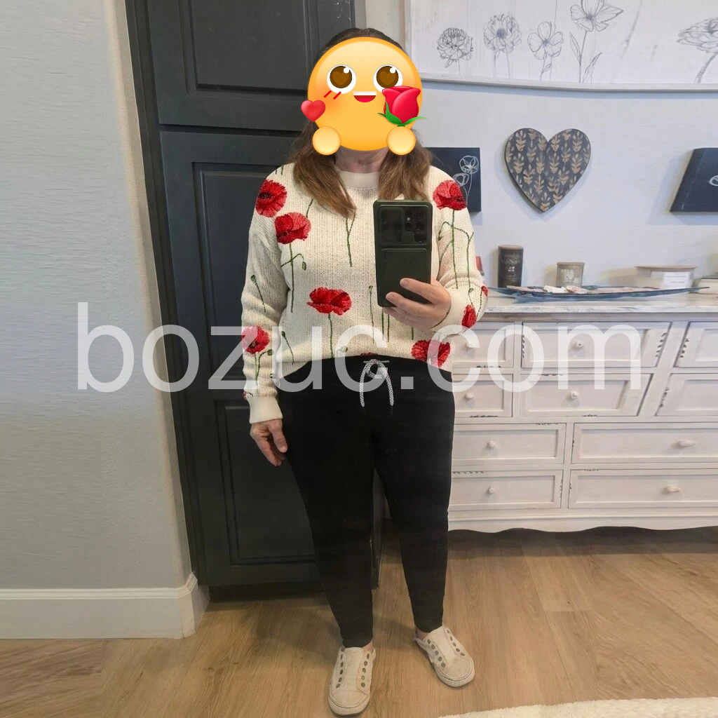 This poppy print top is absolutely beautiful! The vibrant red flowers stand out so nicely against the soft cream color, and the stitching looks so detailed and well-made. The fabric is cozy and lightweight, perfect for layering in spring and fall. The curved hem adds a cute, unique touch, and I’ve gotten so many compliments on how artistic and eye-catching it is. I’m in love!